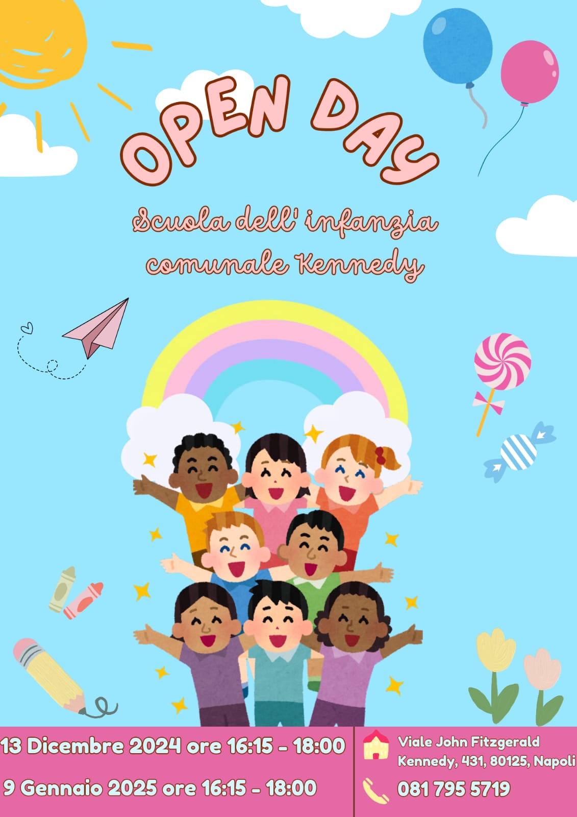 Descrizione OPEN DAY Scuola dell'Infanzia Comunale "Kennedy" - Municipalità 10: Open Day il 13/12/2024 dalle ore 16.15 alle 18.00 e il 9 gennaio 2025 n.16.15-18.00 Graduatorie dei bambini iscritti